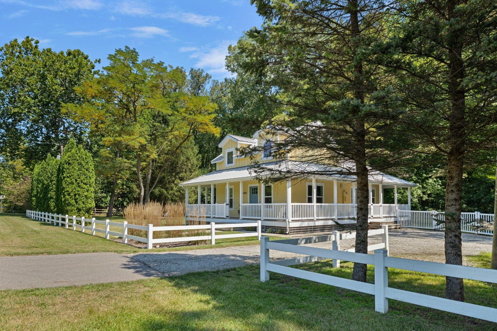 Charming Modern Farmhouse with Pool in Harbor Country. This picture-perfect, modern farmhouse is an absolute gem! Set on a spacious half-acre lot, this bright and airy home offers a welcoming wraparound porch, a fenced pool area, and a backyard ideal for outdoor activities. Thoughtfully renovated in 2018 with a new metal roof and updated mechanicals, this home is move-in ready and meticulously maintained. The open and inviting floor plan features beautiful wood floors throughout and a stunning original brick wood-burning fireplace that adds warmth and character. The chef's kitchen with peninsula seating flows seamlessly into the living area and there is a beautiful formal dining room, which includes a built-in wet bar and beverage fridge andis perfect for entertaining. The main level includes a luxurious en suite primary bedroom for ultimate convenience, while upstairs you'll find two additional bedrooms, one of which has its own en suite, as well as a large family room/playroom. Being sold turnkey with minimal exceptions, this home is ready for your immediate enjoyment. It's also an excellent rental candidate, with seasonal revenue history and further potential just in time for peak vacation season (see Rental Projections in Documents). The outdoor space is equally impressive, featuring a pool, patio, fire pit, and plenty of room for fun and games. Conveniently located across from the popular new bike and running path, just a 4-minute drive (or 2.4-mile bike ride) to beautiful Cherry Beach, and close to all local amenities. Don't miss out on this incredible Harbor Country retreat - schedule your showing today!